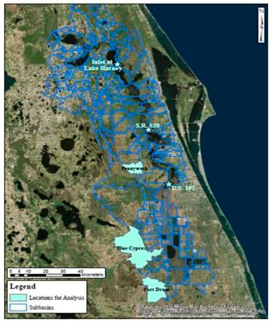 21]. The watershed is comprised of multiple sub-basins of various sizes and hydrologic properties that drain toward the flow way of the SJR. Due to its size, the SJR has been divided into major “Basins” by the St. Johns River Water Management District (SJRWMD), a state agency whose work focuses on managing water supply, water quality and natural systems management, and flood protection (SJRWMD, 2012). The Upper St. Johns River Basin (USJRB) acts as the headwaters of the SJR and has an area of approximately 4530 km
