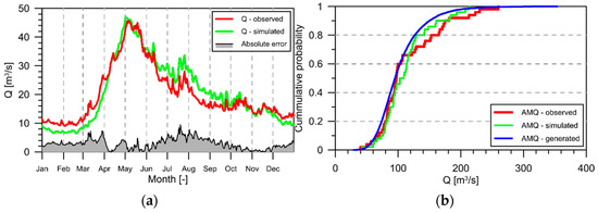 Figure 3a shows that the generated AM series of precipitations comprised much fewer values (in terms of frequency) in a range between 55 and 60 mm than the one observed. Nevertheless, a much bigger challenge is associated with large watersheds, in which case the generated inputs should be spatially distributed to account for the large spatial variability of precipitation in such watersheds.