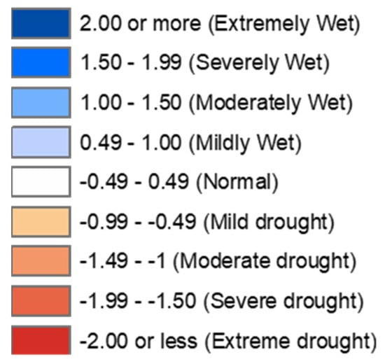 - Karavitis, C.A.; Alexandris, S.; Tsesmelis, D.E.; Athanasopoulos, G. Application of the Standardized Precipitation Index (SPI) in Greece. Water 2011, 3, 787–805. [Google Scholar] [CrossRef]