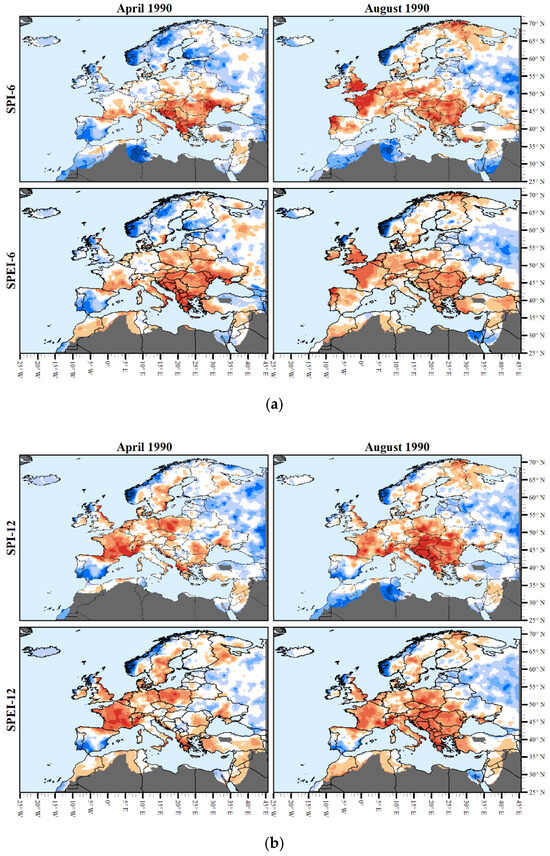 SPI and SPEI for Europe on April and August 1990, (a) 6-month step and (b) 12-month step.