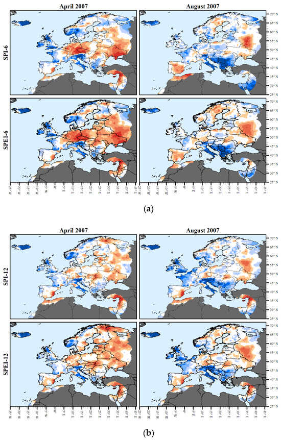 SPI and SPEI for Europe on April and August 2007, (a) 6-month step and (b) 12-month step.