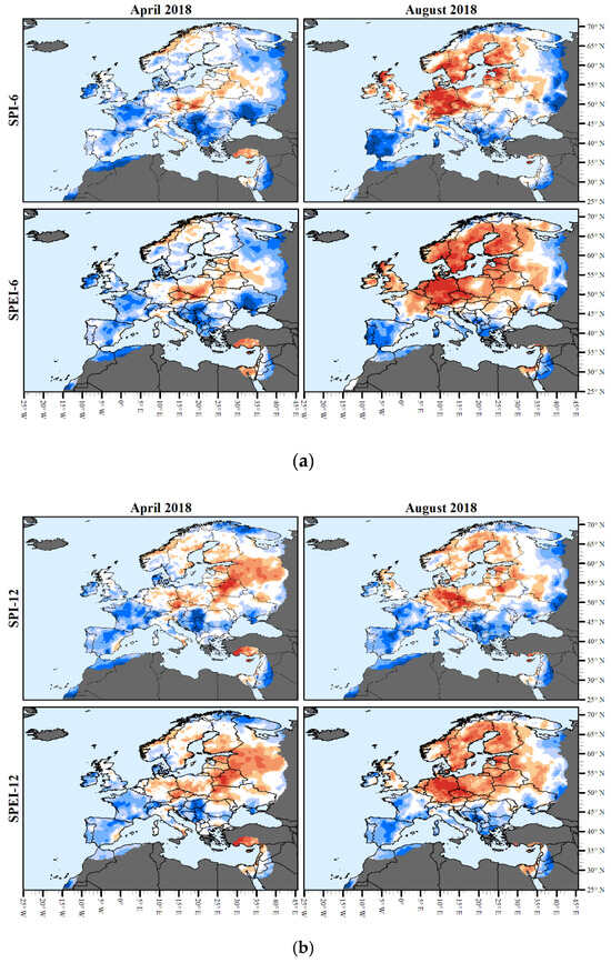 SPI and SPEI for Europe on April and August 2018, (a) 6-month step and (b) 12-month step.