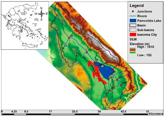 The Lake Pamvotida Basin is a closed basin with an area of 340.78 km2, located in Epirus, a region in Northwestern Greece (Figure 1). Part of the basin’s runoff flows through small streams into Lake Pamvotida and a smaller portion of the runoff is diverted to the adjacent Kalama River basin to the northwest). The city of Ioannina is located at the middle of the western bank of the lake and it is the capital and largest city of the Ioannina regional unit and of the administrative region of Epirus. Its population is 112,486, according to 2011 census.