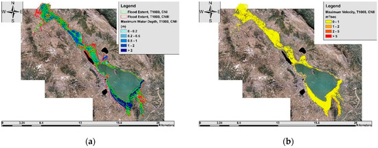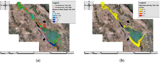 The two methodologies, outlined before, for rural and not significant settlements and for significant urban areas (e.g., Ioannina City) have been applied in the hydraulic simulations. The simulation results for inundated areas, water depth and maximum flow velocity are presented in Figure 2 (for T = 50 years) and Figure 3 (for T = 1000 years), respectively. The results indicate that the inundated area increases with the return period of the event and the depth of water is more sensitive than the water velocity.