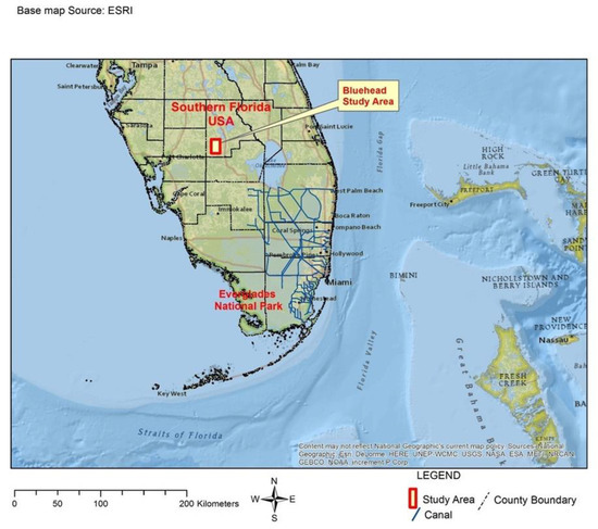 The Blue Head Ranch property consists of 127 km2 located in Highlands County, Florida, USA. The Blue Head Ranch is located within the Fisheating Creek watershed or basin on the northwestern side of Lake Okeechobee. Figure 1 shows the general location of the property in Florida, USA. Figure 2 shows the boundary of the Fisheating Creek watershed along with the property line for the Blue Head Ranch.