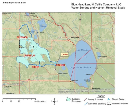 Table 3 clearly demonstrates that the stream flow datasets are highly non-normal and that median values probably represent the most reliable flow statistic for central-tendency comparison purposes. Also, it is evident from Table 3 that the overall flows within Fisheating Creek are low to moderate. The location of the Bluehead Ranch property is between stream gauge 0255600 and gauge FishV_O, meaning that a median flow of 0.48 m3∙s−1 or less would be expected under normal conditions. Furthermore, in reviewing the location of various sub-basins within the Fisheating Creek, it is clear that any engineered nutrient removal projects located on the Bluehead Ranch property would be constrained by the availability of water from certain sub-basins or portions of the main stem Fisheating Creek. Figure 3 depicts the location of the key sub-basins important to the Bluehead Ranch property. The figure shows that the Bluehead Ranch can only really exert a positive effect on six sub-basins within the Fisheating Creek watershed, including portions of the main creek stem.