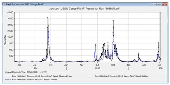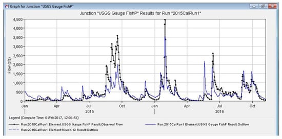 As demonstrated in the table, the model meets all of the calibration goals and, therefore, can be used for planning and preliminary design purposes. Figure 5 and Figure 6 show model hydrographs from the calibration and validation periods comparing simulated flows in blue and observed (actual) flows in black. Note that the graphs were taken from a published report for the client, and the units are in cubic feet per second (ft3∙s−1) as per the client’s request.