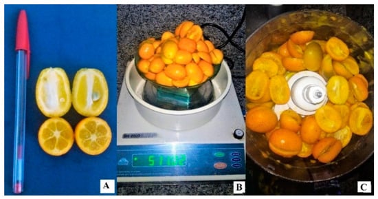 Images of kumquat fruits collected in Brazil. (A) longitudinal and cross-section; (B) weighing in semi-analytical balance; (C) processing. Source: Personal collection.