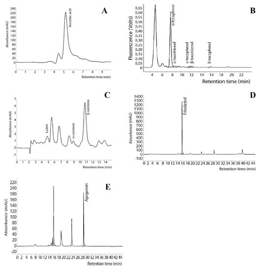 Analysis by HPLC in kumquat (peel and pulp) collected in Brazil. Vitamin C (A); vitamin E (B); carotenoids (C); eriodictiol (D) and apigenin (E).