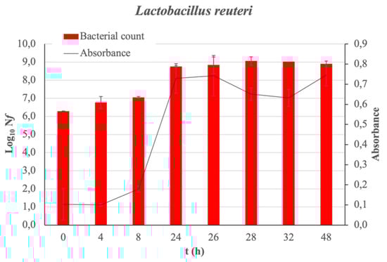 L. reuteri growth curve. The bar charts show the growth of bacteria in Log10(Nf) as function of incubation time. Absorbance measured as a function of incubation time is also plotted with a line graph. In all cases, the standard deviation is represented.