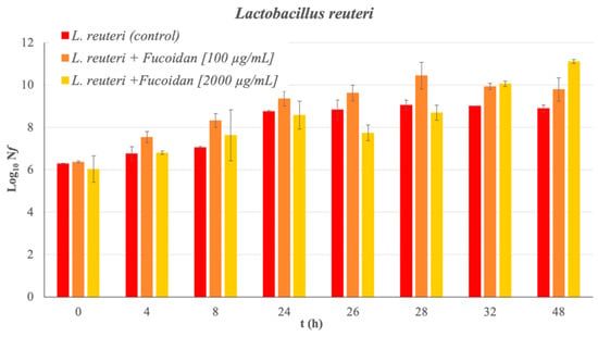 Absorbance measurements and bacterial counts allow for the corresponding growth curve of the bacteria under study to be obtained without the presence of fucoidan (control sample) over 48 h (see Figure 1). The latency phase of L. reuteri extends to 8 h of incubation. The exponential growth phase is observed from 8 to 24 h of incubation. The analysis of the bacterial growth when the Man Rogose Sharp [16] Broth (MRSB) medium is supplemented with fucoidan at two concentrations (100 and 2000 μg/mL) provides interesting results. Figure 2 reflects the results of the growth evolution (Log10(Nf), where Nf = is the number of living microorganisms at each studied time (in Colony-Forming Units per milliliter (CFU/mL)) both in the control sample and in that supplemented with fucoidan, at different concentrations. Fucoidan has a prebiotic effect on L. reuteri. The prebiotic effect is at its maximum, reaching 2.21 ± 0.19 cicles Log10, at 48 h of incubation.