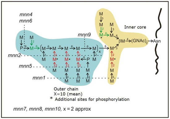 The glycosylation process in eukaryotic cells has been extensively studied, and most steps have been almost completely deciphered. In these studies, the yeast Saccharomyces cerevisiae, a reference model organism in many laboratories, has played a central role. The process of glycosylation of N-oligosaccharides in S. cerevisiae is the same as that of higher eukaryotes in the early stages, which take place in the endoplasmic reticulum (ER) which lead to the synthesis of the so-called “inner core” [1]. However, in the stages that take place in the Golgi apparatus, the so-called “outer chain” is added. These stages are different from higher eukaryotes, because the outer chain contains exclusively mannose and lacks other monosaccharides. All N-linked oligosaccharides in S. cerevisiae are “high mannose” type. In the study of the glycosylation process in S. cerevisiae, the isolation and characterization of defective mutants in the process has been essential. Among them, two groups are worth highlighting: the alg mutants (Asparragine-linked glycosilation defective) affected in the stages of the ER [1], and mnn (mannan defective), affected in the stages that occur in the Golgi apparatus [2]. Figure 1 shows the defects of mnn mutants in N-oligosacharides structure. Among the latter, mnn9 presents the most drastic defect because it blocks the addition of the whole outer chain in Golgi [2,3]. The rest of the mnn mutants have also been identified by different research groups working on glycosylation studies [2,4,5,6,7,8,9]. However, the genetic defect of mnn mutants has only been identified in the case of the mnn3 mutant [10].