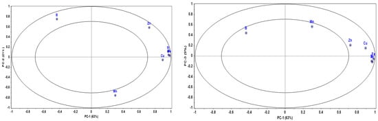 Principal Component Analysis (PCA) was exploited to evaluate the clustering of the samples divided into the A, B, C, D, E, and F groups (as defined by topic 3.1), according to the mineral profile. After the analysis of perceptual maps, it was observed that microelements were highest correlated and better explained the variability present in the sample set analyzed. So, the role of microelements in this classification was better investigated and a new classification model based on PCA was designed. The perceptual map showed that Fe, Cu, Al (as well as Si) presented the highest correlation and explained the variability of data, as previously indicated [16]. PC1, PC2 and PC3 are responsible for explaining 93% of the observed variance (Figure 1).