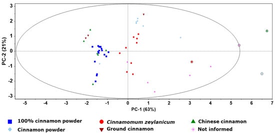 The six groups of samples were coherently classified and the groups B and C (those in which C. zeylanicum was the ingredient) were strongly clustered. Samples acquired in bulk as well as those whose labels declared traces of grains and/or spices, i.e., groups A, D, F, presented the highest variability and were dispersed. The group in which C. cassia was the main ingredient (group E) presented a high clustering for four samples, although the other four samples were dispersed among other groups. Four samples were pointed out as outliers according to the model, one of them did not cluster to C. zeylanicum group, another is in the limit established, and two others did not present the same profile of all other samples analyzed. Figure 2 shows the clusters observed for the samples analyzed, demonstrating the possibility of using this approach for classification of cinnamon available in retail.