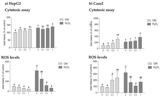 The AC or bioactivity of samples (as chemoprotectors or exogenous antioxidants) in protecting HepG2 and Caco2 cells against oxidative stress induced by H2O2 was studied, measuring the cell viability and reactive oxygen species (ROS) levels. The results are shown in Figure 1a, b. First, we checked the basal effect of the polyphenols extracts on cell viability, evaluating the cytotoxic effects with different poliphenols concentrations.