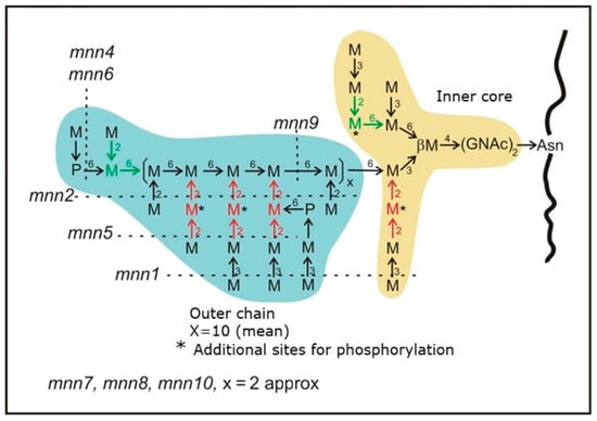 - Ballou, C.E. Isolation, characterization and properties of Saccharomyces cerevisiae mnn mutants with nonconditional protein glycosylation defects. Methods Enzymol. 1990, 185, 440–470. [Google Scholar] [PubMed]