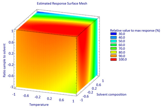 The objective of the optimization by Response Surface Methodology (RSM) was to obtain the best combination setting between the three independent factors of the MAE, namely temperature (x1), solvent composition (x2), and solvent to sample ratio (x3), achieving the highest recovery result. Based on the predicted model, a three-dimensional mesh plot was constructed to predict the relationship between the independent factors and responses (Figure 2). The highest response was obtained with the optimum MAE yield (103.54%) at the coordinate of 0.534 for extraction temperature (x1), −0.365 for solvent composition (x2), and 1 for ratio sample to solvent (x3). Henceforth, the optimum extraction recovery for the studied phenolic compound in Roselle can be achieved by applying 68 °C of extraction temperature using 59% methanol in water as the extraction solvent with a 20:1 solvent to sample ratio. Although the present study revealed similar results as the previous one [32], the temperature reported here was much lower. This temperature setting could guarantee better stability of the thermolabile phenolic compounds such as rutin [33]. Therefore, a higher extraction yield should be expected. Additionally, the higher solvent to sample ratio should allow for faster extraction methods because of diffusion rate [34].