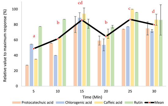 To achieve an efficient MAE for phenolic compounds in roselle, extraction kinetics was performed by checking the extraction yield over a period of time. The extraction kinetics was evaluated by running extractions at the optimum MAE condition for 5 to 30 min. Afterward, the evaluation was conducted using the average of the relative value to the maximum yield of the extracted compounds (Figure 3). The ANOVA suggested that the extraction time significantly affected the extraction yield (p < 0.05). The proposed extraction time for phenolic compounds from roselle was 15 min to achieve the highest yield (LSD, p < 0.05), as an extended extraction time to 30 min did not enhance the extraction recovery compare to the longer extraction time. Increasing the extraction time will not alter the extraction yield after the full recovery was reached. While the decrease of the yield with longer extraction time might occur due to the degradation of the compounds or interaction between compounds as a result of microwave exposure [34,35].