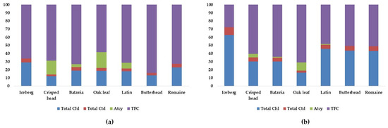 Relative composition of total chlorophylls (Chl), carotenoids (Total Ctd), anthocyanins (Atcy) and total phenolic compounds (TFC) of 7 types of lettuces in: (a) field production; (b) greenhouse production.