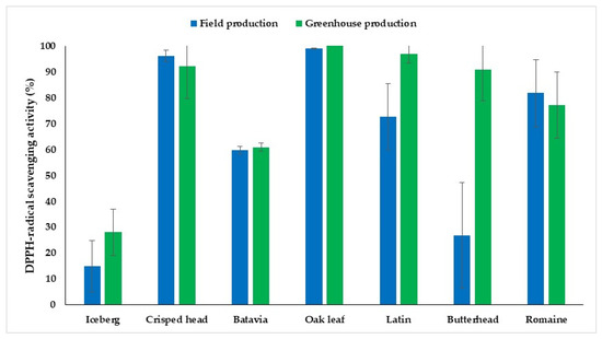 Antioxidant activity expressed as 2.2-diphenyl-1-picril-Hidrazil -radical scavenging activity (%) of 7 types of lettuces in two cropping systems: field and greenhouse production.