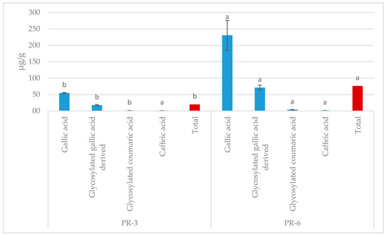 The polyphenol profile in pâté enriched with persimmon flour. CP: control pâté; P-3RB: pork liver pâté enrichment with 3% of persimmon flour cv. “Rojo Brillante”; P-6RB: pork liver pâté enrichment with 6% of persimmon flour cv. “Rojo Brillante”. Total: Sum of four polyphenols quantified. Different case lower letters (a,b) for each individual phenolic compound and the total indicate significant differences between the two studied samples.