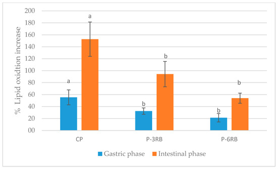 Lipidic oxidation increase (%) of pork liver pâté samples after in vitro gastrointestinal digestion. CP: control pâté; P-3RB: pork liver pâté enrichment with 3% of persimmon flour cv. “Rojo Brillante”; P-6RB: pork liver pâté enrichment with 6% of persimmon flour cv. “Rojo Brillante”. Different case lower letters (a,b) for each simulated digestion phase indicate significant differences between the three studied samples.