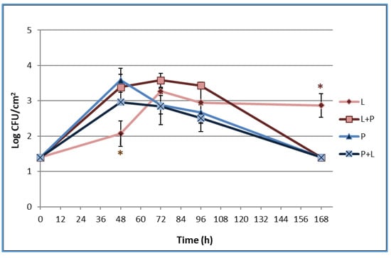 Dynamics of sessile cells of L. monocytogenes LM5 and P. fluorescens pf5 in mono- and dual-species conditions on stainless steel (SS) coupons at 12 °C for 168 h. The asterisk (*) means statistically significant difference between the mono- and dual-species of each strains for the same incubation time (* p < 0.05). L: L. monocytogenes in single-species; L + P: L. monocytogenes in dual-species; P: P. fluorescens in single-species; P + L: P. fluorescens in dual-species.