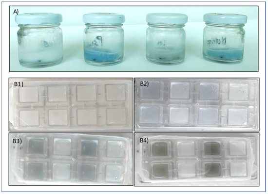 (A) Blue pigment colour appearance during the evaluation of biofilm formation on SS coupons in glass containers. From the left: control, P. fluorescens pf5, L. monocytogenes LM5, and the dual-species system. (B) Blue pigment colour evolution during the CLSM analysis: (B1) 48 h, (B2) 72 h, (B3) 96 h, and (B4) 168 h.