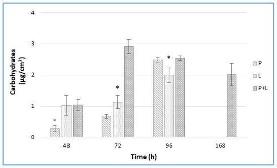 Carbohydrates amount (µg/cm2) from L. monocytogenes LM5 and P. fluorescens pf5 biofilms on SS coupons in mono- and dual-species at 12 °C for 168 h. The asterisk (*) means statistically significant difference between the mono- and dual-species of each strains for the same incubation time (* p < 0.05). P: P. fluorescens in single-species; L: L. monocytogenes in single-species; P + L: P. fluorescens and L. monocytogenes in dual-species.