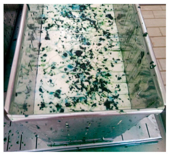 Fresh raw ewe milk standardized to 6% fat content was filtered and pasteurized at 63 °C for 30 min. After cooling (37 °C), a direct vat of yogurt starter culture (Streptococcus salivarius subsp. thermophilus and Lactobacillus delbrueckii subsp. bulgaricus) at a rate of 0.02 g kg−1 was added at a rate of 0.02 g kg−1, as per producer’s instructions, and left undisturbed for 30 min. Then, 0.02 mL kg−1 of liquid rennet and 0.02 mL kg−1 of CaCl2 (40% w/v) was added so that the coagulation could be achieved in about 30 min. The cheese curd was cut into small pieces (cubes of 2 cm side) and transferred into 2 rectangular molds. In one of the molds, between the layers of the curd that were added, a quantity of powdered Spirulina (0.25%) was spread (Figure 1).