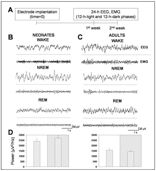 In this work, we analyzed the sleep–wake cycle and characterized the patterns of electrical activity in late neonatal and adult mice [