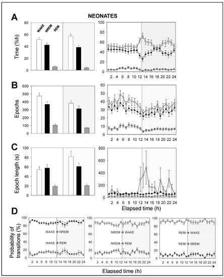 Figure 3D). Hourly data trends during the recording session showed mid-phase (6 hours elapsed time) shifts, which confirmed the higher probability of transitions from NREM sleep to wakefulness than from NREM to REM sleep (86% vs 14%, for neonates), from wakefulness to NREM sleep than from wakefulness to REM sleep (88% vs. 12%), and from REM sleep to wakefulness than from REM to NREM sleep (91% vs. 9%). That is, transitions between behavioral states in mice shift in periods of 6 hours from the start or end of the light phases, reaching mid-phase plateaus. Thus, the sleep–wake cycle slowly adapts to the external changes and prepares for the next state.