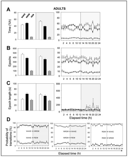 Figure 2B,C), the number of epochs for each behavioral state, especially for wakefulness, decreased during the 12 h-dark phase. Wakefulness epochs were longer at nighttime than they were at daytime, while those of NREM and REM sleep remained steady. In adults, the number of epochs for each behavioral state tended to reduce during the recording session, showing slightly higher values at daytime than those at nighttime (