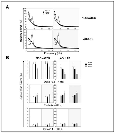 Figure 4B). There were no remarkable differences in the relative band power between both light phases for any frequency band within either age group. Within the delta (δ) frequency band, neonates were characterized by a greater relative power than adults for each behavioral state. Wakefulness showed the greatest relative power, followed closely by that of NREM sleep. Within the theta (θ) frequency band, we found the opposite pattern: adults were characterized by a higher relative power than neonates for each behavioral state. REM sleep showed the greatest relative power. Within α (and β, during wakefulness and NREM sleep) frequency bands, we concluded the same as for the θ frequency band upon the neonate–adult pattern, but with overall smaller relative band powers for each behavioral state (