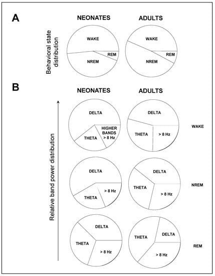 20]. Our methodology is confirmed with the results on adult C57BL/6, and provides novel data regarding late neonatal C57BL/6. Conceptually, these sleep–wake cycle differences are linked to brain maturation, since, overall, the brain shifts to higher frequencies through the neonatal–adult transition [