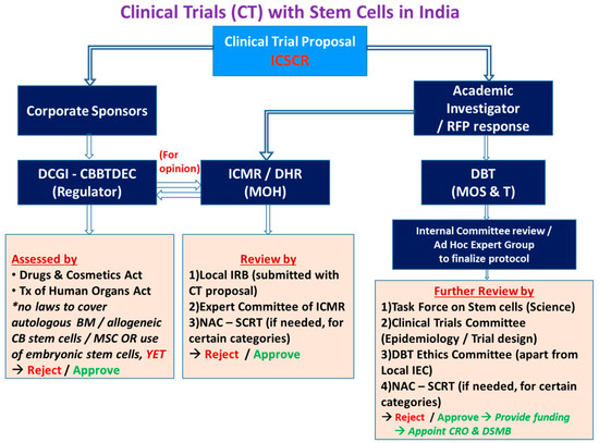 According to the American Society for Blood and Marrow Transplantation guidelines, the approved indications for hematopoietic transplantation have been framed for adult and pediatric malignant, non-malignant, and solid tumors. The ICMR-DBT guidelines to conduct stem cell research in India have evolved since 2007. In 2017, the need for stem cell use as Clinical Trial (CT), levels of manipulations, CMC, release criteria, manufacturing facility—GMP and GLP certified, ICSCR registration mandatory was defined. To carry out a trial, CDSCO shall be issuing four categories of licenses/approval right from obtaining facility licenses (form 29), the conduct of CT, manufacture (form 46/import 45) and lastly, product for sale (form 28/form 10) (Figure 4). According to the guidelines, minimally manipulated cells can be used for stem cell therapy without any approval. Furthermore, it is not clear if a single IC-SCR or Multiple IC-SCR approval is required for undertaking multi-centric, DCGI approved clinical trials. The product has to undergo rigorous preclinical testing before commercialization and that incurs an additional cost. Some issues need to be addressed for rapid commercialization of Regenerative Medicine products and early patient access for major unmet medical need.