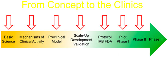 In the classical framework of clinical research, the idea has to undergo preclinical research. A phase I is then performed to look for any adverse events by performing dose escalation studies and mainly from the view-point of safety, while a phase II study focuses on the benefit with a set cell dose. A phase III trial is conducted as a randomized trial to test the efficacy against a standard of care of placebo and a phase IV trial mainly focuses on the long-term monitoring usually a post-marketing study. The major points to consider are the type of cell used and whether the cells are minimally manipulated or not. In the USA, the FDA recommends a specific application for the conduct of a clinical trial (Figure 7). From standard operating protocol, validations, release criteria to stability are required.