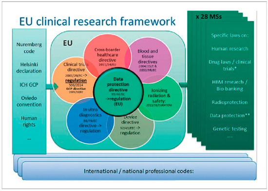 The concept of GCP was developed by the international conference on Harmonization (ICH) based on the Declaration of Helsinki. GCP is defined as an international ethical and quality’ standard for the design, conduct, performance, monitoring, auditing, recording, analyses and reporting of clinical trials that provides assurance that the data and reported results are credible and accurate, and that the rights, safety, and well-being of study participants are protected. This has become a legal obligation in Europe since 2004. The EU clinical research framework follows several professional codes that are being imposed on human research, clinical trials, data protection, and bio-banking (Figure 9). At the outset, the ICH GCP has 13 core principle components which ensure that the clinical trial is conducted in a safe and sound manner.