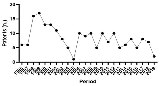 The trend of the patents awarded over time is reported in Figure 1. The chart reports the number of patents starting from 1996, as the employment of AMS in farms dates to the 1990s. The number of patents reached the maximum number in 1998–1999, when the first voluntary milking systems were commercialised [12]. After a sharp decrease, the patent registration has stabilized, despite natural oscillations.