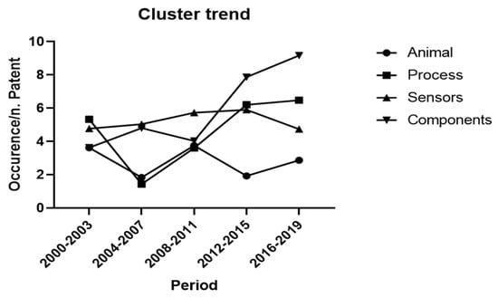 After the pre-processing, the words included in the dataset were grouped into four clusters: “Animal”, “Process”, “Sensors” and “Components”. First, the trend of the four clusters over the years was analyzed. Then, a word frequency analysis was carried out within each cluster to identify the patent trend tendencies. Frequency analysis was also applied to the applicants to determine the top contributing countries.