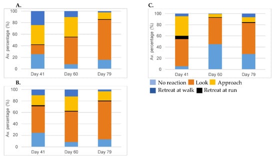 All pens had significantly different avoidance test distances for between treatments on days 41 ( = 9 = 954, p = 0.009), 60 ( 10.104, p = 0.006) and 79 ( = 37.708, p = 0.000) (Figure 1). Between days 40 and 80, avoidance distances significantly decreased for Con ( = 20.364, p < 0.001) and IP ( = 15.815, p < 0.001), but not for OP. Overall, Con had the largest average decrease in avoidance distance (5.8 m), but also had the largest average avoidance distance on day 40 (9.6 m) compared to the OP (6.3 m) and IP (4.8 m). Cattle reactions to the novel person varied between pens across the study, with IP having the lowest ‘no reaction’ on day 41 ( = 8.4, p = 0.015) but the highest on day 60 ( =11.6, p = 0.003). On day 41, Con ‘looked’ the least ( =11.0, p = 0.004) while OP ‘retreated at a walk’ the least ( = 6.1, p = 0.048). On day 60, IP ‘retreated at a walk’ ( = 11.6, p = 0.003) and ‘at a run’ the least ( = 10.9, p = 0.004). Behaviour did not significantly differ between pens on day 79. Both Con ( = 12.0, p = 0.002) and OP ( = 7.6, p = 0.002) increased ‘looking’ at the novel person across the study, while ‘retreat at run’ decreased for Con ( = 7.2, p = 0.028), on day 79 for OP ( = 6.3, p = 0.042) and day 60 for IP ( = 9.5, p = 0.009). ‘Retreat at walk’ was lowest on day 39 for Con ( = 6.3, p = 0.042) and day 60 for IP ( = 10.3, p = 0.006). IP had more ‘no reaction’ on day 60 ( = 10.3, p = 0.006) (Figure 1).
