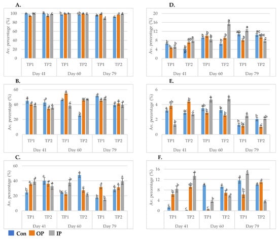 Nine of the 11 behaviours significantly differed across day, time point (TP) and treatment (Figure 2). The percentage of each pen standing significantly changed across all days (F4,228 = 114.0, p < 0.001); on day 41 for TP1, Con and IP were standing more than OP, while at TP2, Con were standing more than exercise pens, and IP more than OP. For TP1 on day 60, treatments pens were standing more than Con. For TP1 on day 79, OP were standing more than Con and IP, and Con more than IP, while at TP2, exercise pens were standing more than Con. Across TPs, Con were standing less at TP2, while more IP were standing more at TP2. For TP1, Con and IP were standing more on day 41 than days 60 and 79, and for Con more on day 60 than 79, while OP were standing least on day 41. For TP2 Con were standing more on day 41 than days 60 and 79, while least were standing for OP on day 41 (Figure 2A). For resting (F4,228 = 17.6, p < 0.001), for TP1 on day 60, OP were resting more than Con and IP, and IP less than Con, while for TP2, Con were resting less than exercise pens. For TP1, OP were resting more on day 60 than 41, IP cattle were resting more on day 79 than 41 and 60. For TP2, Con cattle were resting more on days 41 and 79 than 60, while OP cattle were resting more on day 60 and IP cattle more on day 60 than 41 and 79 (Figure 2B). For vigilance (F4,228 = 46.3, p < 0.001), Con cattle were less vigilant than exercise pens at TP1 on day 41, with Con cattle becoming more vigilant at TP2. On day 60, IP were more vigilant than OP at TP1, while Con were more vigilant than exercise pens at TP2. Con cattle were more vigilant at TP2 than TP1, while IP were more vigilant at TP1 than at TP2. For TP1 on day 79, OP were more vigilant than IP and Con, while both Con and IP were more vigilant at TP2 than TP1. For TP1, Con and IP were more vigilant on days 41 and 60 than 79, while OP were more on days 41 and 79 than 60. For TP2, Con were more vigilant on day 60 than 41 and 79, and more on day 41 than 79, while OP were more on day 41 than 60, and IP more on days 41 and 79 than 60 (Figure 2C). For ruminating (F4,228 = 39.4, p < 0.001), exercise pens were ruminating more than Con at TP2 on day 41, with IP ruminating more at TP2 than TP1. For TP2 on day 60, IP were ruminating more than Con and OP, and were also again ruminating more at TP2 than TP1. For TP1 on day 79, IP were ruminating more than OP, but were ruminating more at TP1 than TP2. For TP1, all pens were ruminating more on days 60 and 79 than 41, with IP also more on day 79 than 60. For TP2, all pens were ruminating less on day 41 than 79, while for Con and IP, day 41 was also less than 60 and day 60 was less than 79 for Con (Figure 2D). For self-grooming (F4,228 = 6.7, p < 0.001), IP were self-grooming less than Con for TP1 on day 41, while Con were less than OP at TP2 and more at TP1 than TP2.