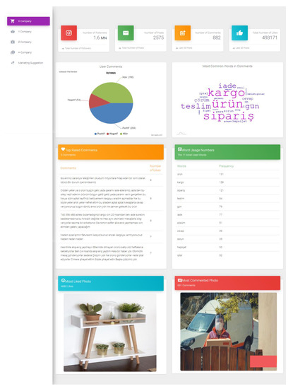 The study was carried out on real e-commerce companies’ Instagram data and the company names were kept confidential (They were named as X Company, Y Company, Z Company, H Company). In the first part of the application, which consists of four menu titles, information about the total number of followers, the total number of posts, the total number of comments in the last 30 posts, the total number of likes in the last 30 posts, sentiment analysis of user comments according to emojis, the word cloud and list of the most used words in the comments, the most liked comments and number of likes, the most liked photo, and the most commented photo were included.