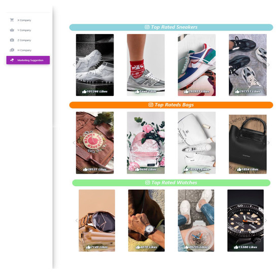 On the “Marketing Suggestion” page, the second section, the most liked sneakers, bags and watches of five leading brands selected for each category were presented to the manager. The marketing suggestion page has been developed to offer marketing suggestions to e-commerce companies, unlike other pages. The main purpose of this page is to reveal the most popular products of the identified big brands on Instagram and to enable e-commerce companies to follow policies regarding those products and products with similar designs. By analyzing these products, e-commerce companies can make various campaigns, discounts, advertisements and reach more sales values by focusing on products similar to these products in determining the product range they will sell. This page will be able to contribute not only to e-commerce companies, but also to stores affiliated with these companies, and even companies that sell these products at retail or supply products from abroad. Interface of the marketing suggestion page is shown in Figure 5.