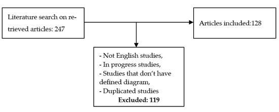 Figure 1 displays the SLR process and the results of the inclusion and exclusion criteria, and 52% of the downloaded publications—that is 128 publications—were included in the study out of a total number of 247 papers.