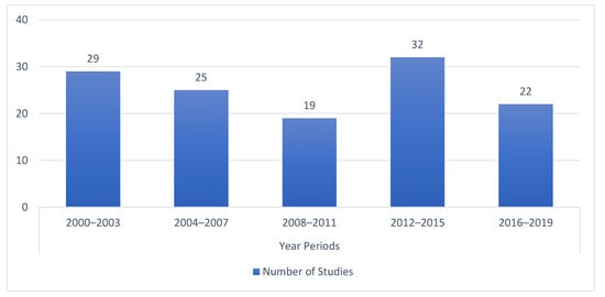 Figure 2 shows the distribution of the publications between 2000 and 2019 through four-year subperiods. The peak subperiod was between 2012 and 2015 at 25%, whereas the subperiod between 2000 and 2004 was 23%, the subperiod between 2004 and 2007 was 20%, and the subperiod between 2016 and 2019 was 17%.
