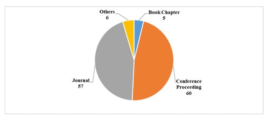 Figure 3 illustrates the distribution of the types of publications. It expresses that the number of conference proceedings was 60, which was 47% of all publications, while the book chapter publications had the lowest number and percentage of 4%, the number of journal papers had a rate of 44%, and the percentage of other publications was 5%.