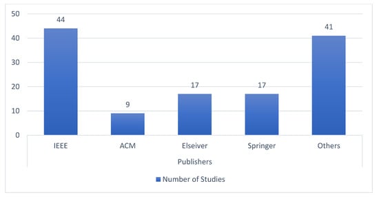 Figure 4 shows the number of publications in terms of the publishers. A total of 44 publications were published by IEEE, while Elsevier and Springer had the same number of publications at 17. Moreover, 9 publications were published in ACM. Other publishers, such as Taylor & Francis, Wiley, and others, had 41 publications.
