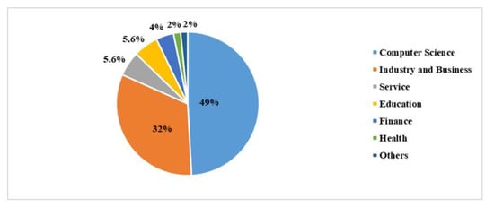 Figure 5 expresses the distribution of publications for each application. The greatest number of publications was mainly published for computer science and industry and business applications, respectively, whereas the least number of articles was published for finance and other application areas.
