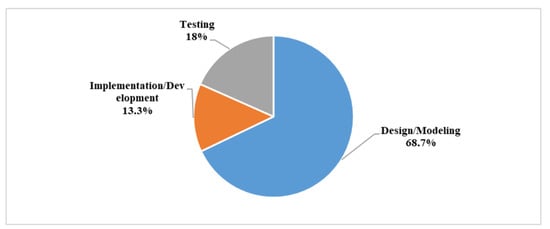 More than two-thirds of the publications used UML diagrams for design purposes. Other purposes for utilizing UML diagrams included testing and implementation or development, with percentages of 18% and 13.3%, respectively. These can be seen in Figure 6 in detail.